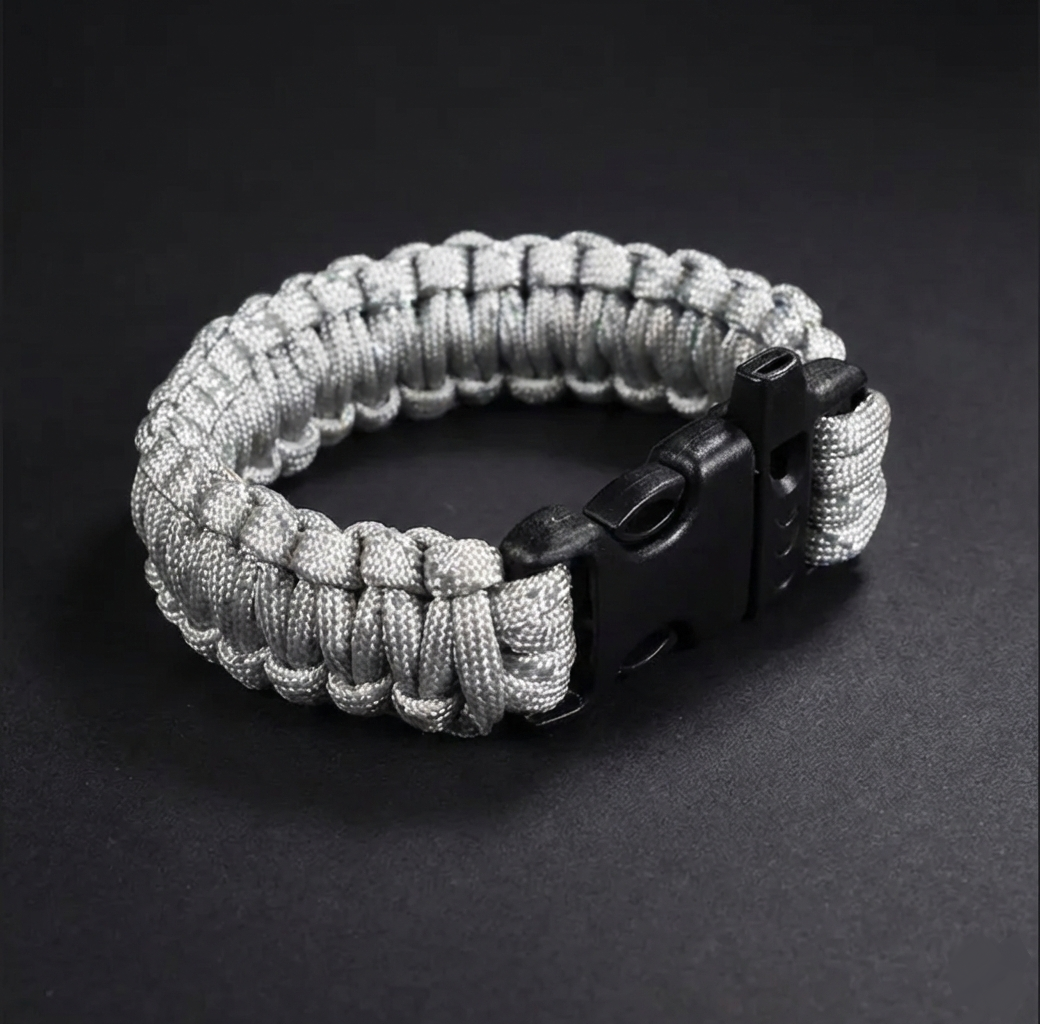 Lleva 3 metros de cuerda de rescate siempre contigo. A diferencia de las pulseras comunes, este modelo usa Paracord de 9 núcleos (más resistente que el estándar) y tejido reflectante para que te localicen en la oscuridad.